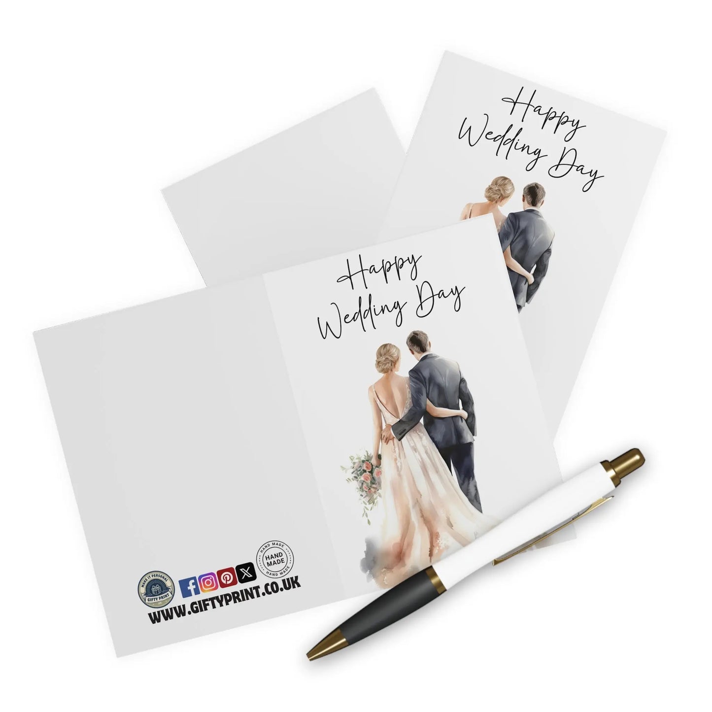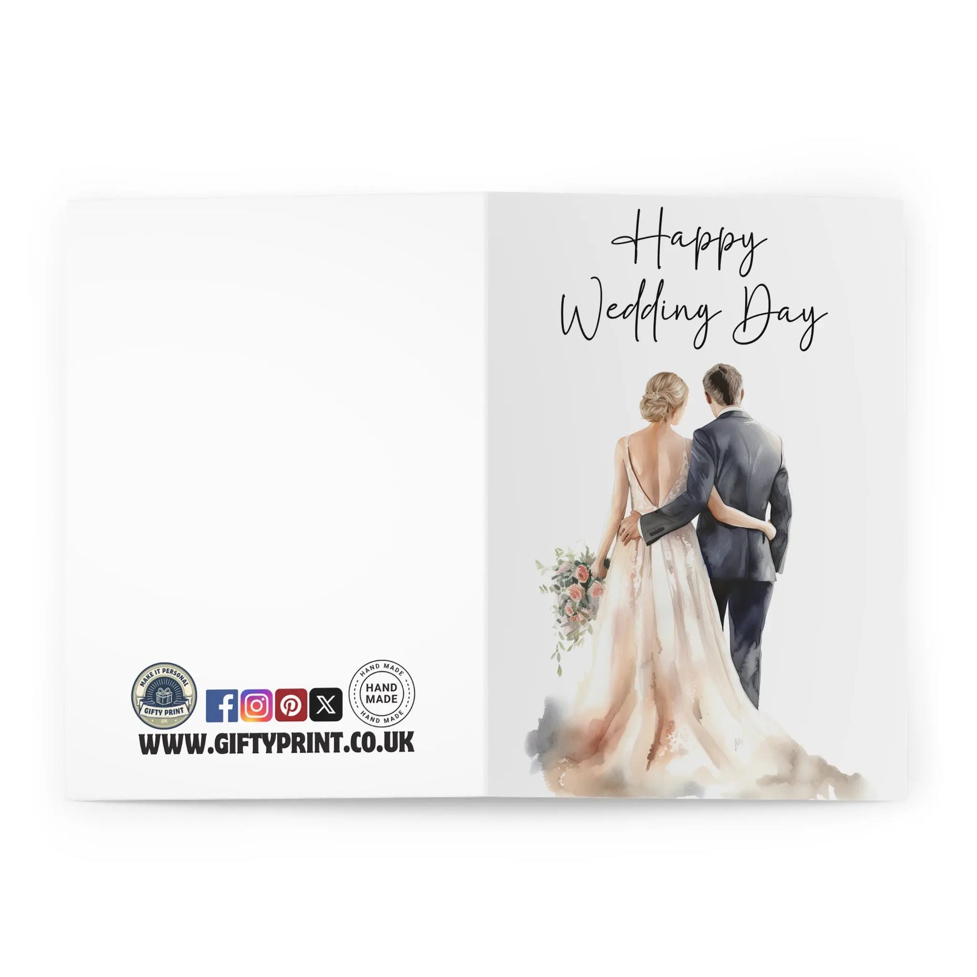 Wedding Card, Make their wedding day extra special with this charming watercolour card featuring a happy bride and groom. Celebrate with style and send them your best wishes on their big day. Perfect for any couple.