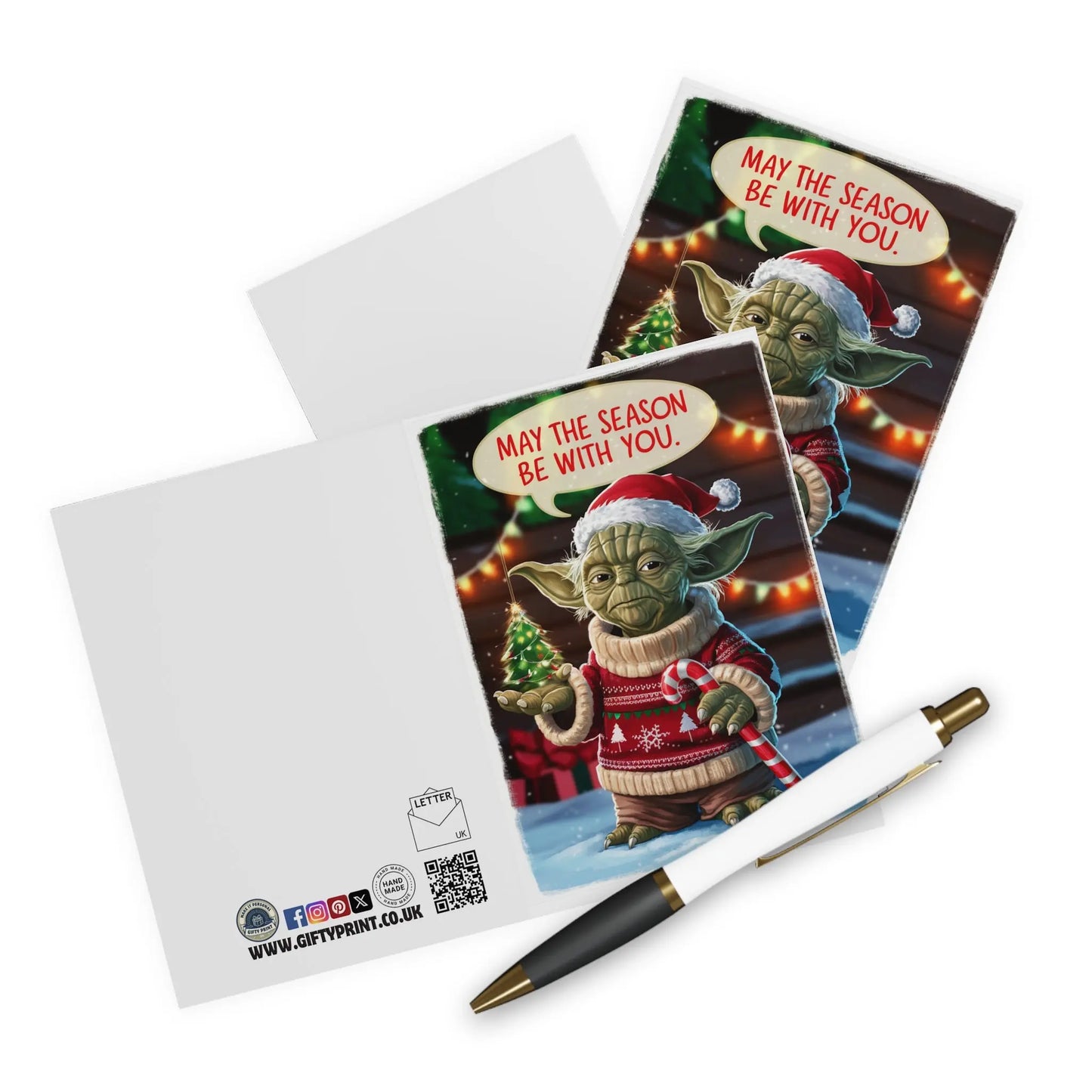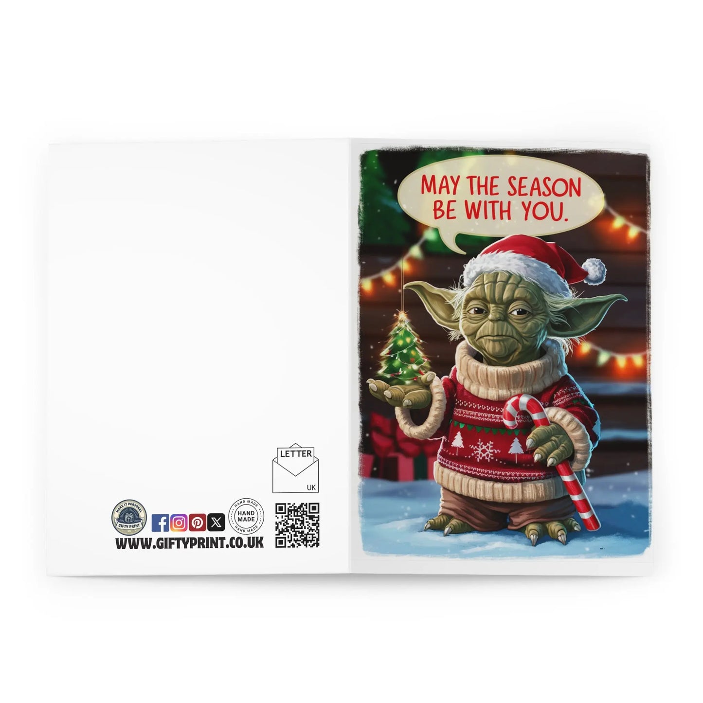 Yoda Christmas Card, Celebrate the holiday season with our Yoda Christmas Card! Featuring the beloved Star Wars character, this card wishes you a "May The Season Be With You." Spread joy and geeky cheer with this unique and fun holiday card. Perfect for any Star Wars fan!